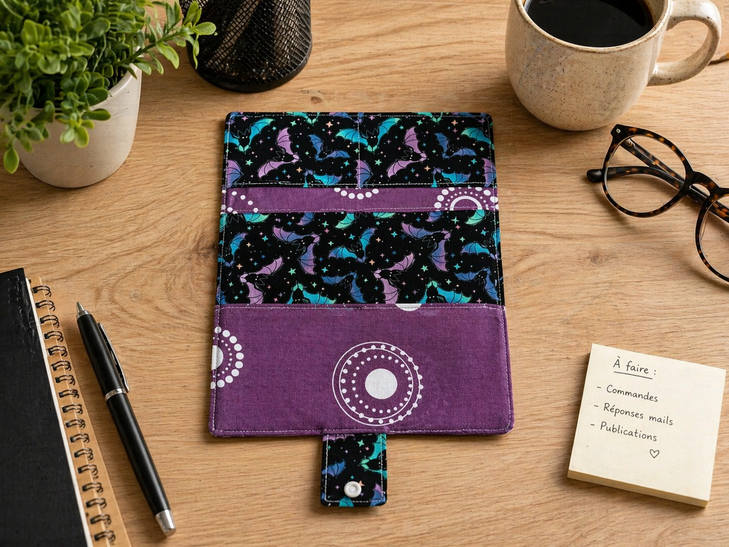 Apportez une touche d’originalité à votre quotidien avec ce protège-chéquier artisanal en tissu, à la fois pratique, sécurisé et unique. Conçu à la main avec soin, il allie fonctionnalité et style grâce à son motif de chauves-souris colorées sur fond noir.